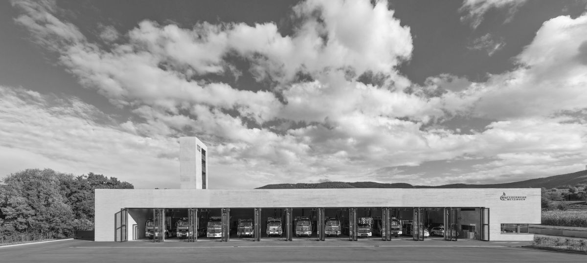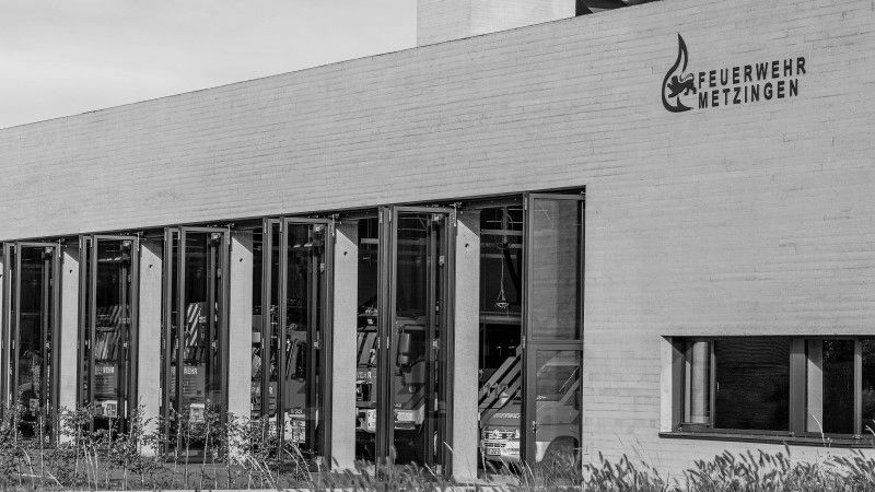 Die leuchtend roten Feuerwehrlastwagen stehen sorgfältig aufgereiht nebeneinander, allesamt akku- rat rückwärts eingeparkt, um jederzeit in Sekunden ausrücken zu können. Das Wimmelbild aus Lösch- und Hu- brettungsfahrzeugen mit Drehleitern, Löschschläuchen und vielfältiger Einsatztechnik übt eine ganz eigene Faszination aus – egal, ob die grazilen, großflächig verglasten Stahl- Falttore geschlossen sind oder offenstehen. Gerahmt wird das stimmungsvolle Bild von einer zurückhaltend elegan- ten Sichtbetonwandfläche, auf der die horizontale Textur einer Fichtenholz-Rauspundschalung zu erkennen ist. Doch Sichtbeton prägt nicht nur das Hauptportal der neuen Met- zinger Feuerwache, sondern auch sämtliche Außen- und des Gebäudeensemble mit mehreren Innenhöfen ist auch ein Bauhof, mit dem sich die Feuerwehr das Gelände teilt.