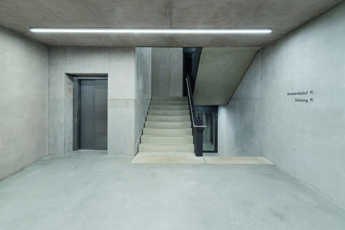 Während die Leichtbeton-Außenwände von innen und außen an der Textur der Rauspundschalung erkennbar sind, kamen für die mit konventionellem Beton errichteten Innenwände der Büros, Pausen- und Schulungsräume glatte Schalungen zum Einsatz. Dieser subtile, aber deutlich spürbare Kontrast zeigt sich insbesondere im Eingangsbereich, wo die verschiedenen, jeweils scharfkantig betonierten Wandoberflächen großflächig aufeinandertreffen. Was in den Innenräumen ebenfalls auffällt, sind die Liebe der Architekten zum minimalistischen Detail und eine harmonische Farbwelt, die im Wesentlichen aus beton- grauen Wänden, geschliffenen Estrichböden, schwarzen Ab- hangdecken und Türen sowie von den Architekten entworfenen Wandbekleidungen und Möbeln aus gebürstetem Eichenholz besteht. Farbakzente setzen allein die im Gebäude verstreuten Sitzmöbel – und natürlich die in der Fahrzeughalle eingestellten Feuerwehrlastwagen. Dort fällt noch etwas ins Auge: Weisen die Sichtbetonwände in den Mitarbeiterräumen überaus grazile Fugen auf, kamen dort und auch in allen anderen untergeord- neten Bereichen Rahmenschalungen zum Einsatz. Die klar er- kennbaren Abdrücke der Rahmenprofile wirken vergleichsweise grob, passen jedoch wunderbar zur Werkstattatmosphäre und zu den Fertigteilstützen und -decken.