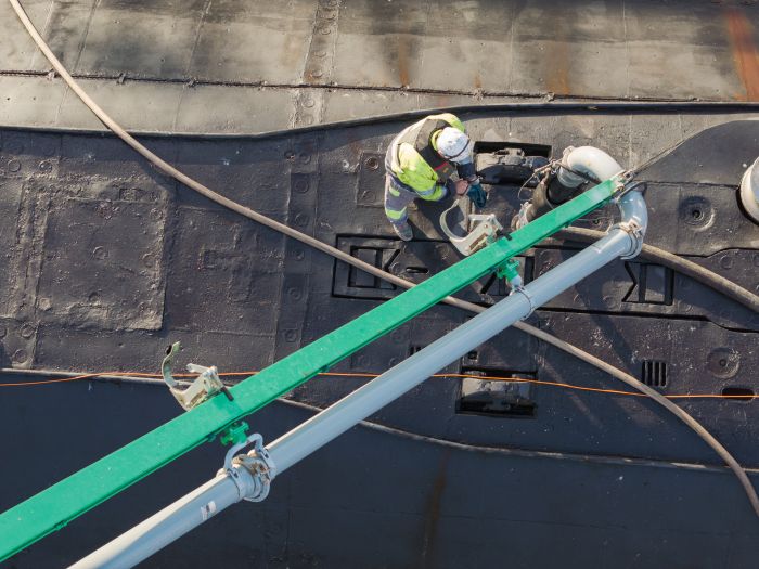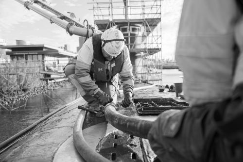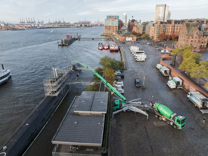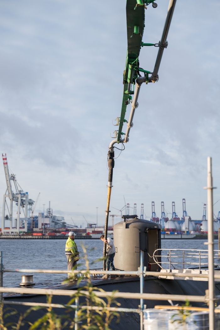 „Die Heidelberg Materials AG hat uns bereits beim Bau des Besucherzentrums mit dem Beton für die Bodenplatte beliefert. Aber auch beim Erhalt des U-Boots spielt das Unternehmen eine entscheidende Rolle“, erklärt Christian Angermann. Nachdem das U-Boot an seinen endgültigen Liegeplatz am Fischmarkt ankam, musste es aufgrund der geringen Wassertiefe auf Grund gesetzt werden. Dafür wurde eine Rinne ausgebaggert. Anschließend musste die Böschung sowie die Fahrrinne mit 8.000 Tonnen Wasserbausteinen wieder in ihren ursprünglichen Zustand versetzt werden. Um ein ungewolltes Auftauchen von U-434 bei Sturmfluten zu verhindern, gab die Behörde vor, das Boot mit zusätzlichen 500 Tonnen Ballast zu sichern. Christian Angermann setzte dazu auf den Unterwasserbeton von Heidelberg Materials, der das Boot optimal ballastiert. Der Unterwasserbeton schützt das U-Boot auch langfristig vor Verfall. „Diese Maßnahme ist notwendig, weil bei jeder Tide über die Austrittsöffnungen Luft in die Tauchtanks eindringt. Der ständige Wechsel zwischen Luft und Wasser führt zu Korrosion und könnte auf Dauer die Struktur des Boots gefährden. Dazu wurde die Betonmischung durch temporär installierte Stutzen, die an den Luftaustritten aufgespannt sind, eingepresst. Der Beton wird in die Ballasttanks des U-Boots mit Hilfe einer 50-Meter-Betonpumpe eingebracht und ersetzt dort das vorhandene Wasser“, erklärt Benjamin Zimmermann von der Heidelberg Materials Beton, Region Nord-West.
