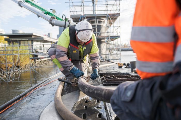 Diese Arbeit erfordert höchste Präzision, denn es dürfen keine Wassernester zurückbleiben. Eingeschlossene Wasserreste könnten im Winter gefrieren und durch die Ausdehnung zu schwerwiegenden Schäden führen. Daher wurde das Einpressen mit äußerster Sorgfalt durch erfahrene Pumpenspezialisten der Heidelberg Materials Pumpen durchgeführt. „Beton gammelt nicht und rostet nicht – er schützt, stabilisiert und hält. Dank seiner alkalischen Umgebung zwischen pH 11 und 13 bleibt der Stahl sicher eingebettet und vor Korrosion bewahrt. Mit seiner fließfähigen Konsistenz und hoher Pumpfähigkeit lässt sich der Unterwasserbeton mühelos einbauen – ganz ohne zusätzliche Verdichtung“, ergänzt Vladimir Prudovskiy, Prüfstellenleiter der Heidelberg Materials Beton, Region Nord-West.