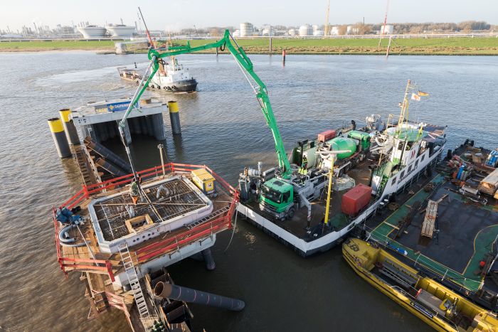 Die erforderlichen Frischbetone wurden von Heidelberg Materials im Transportbetonwerk Stade gemischt und gemäß Bauablauf und terminierter Betonage angeliefert. Neben den normativen Vorgaben galten für die Baumaßnahmen auch die Regelungen der ZTV-W (Zusätzlichen Technischen Vertragsbedingungen für den Wasserbau). Diese schreiben vor, dass massive Bauteile von Wasserbauwerken der Expositionsklasse XF3/XF4 zwingend mit LP-Beton (Luftporen-Beton) herzustellen sind, um die Frostbeständigkeit zu gewährleisten. Gleichzeitig soll der Zementanteil im Beton möglichst gering sein und der eingesetzte Zement mit geringer Hydrationswärme abbinden, um eine Rissbildung weitgehend zu vermeiden. Verbaut wurden im Laufe der zweiteiligen Baumaßnahme Betone der Güte C35/45 XC4, XD3, XS3 und XF4, XA2 nach ZTV-W LB 125 in den Konsistenzen F3 und F4. Hierfür kamen als Bindemittel ein CO₂-reduzierter evoBuild 40 Zement (CEM III A) und ein CEM II ALL aus dem Werk Hannover sowie ein CO₂-reduzierter evoBuild 70 Zement (CEM III B) zum Einsatz.