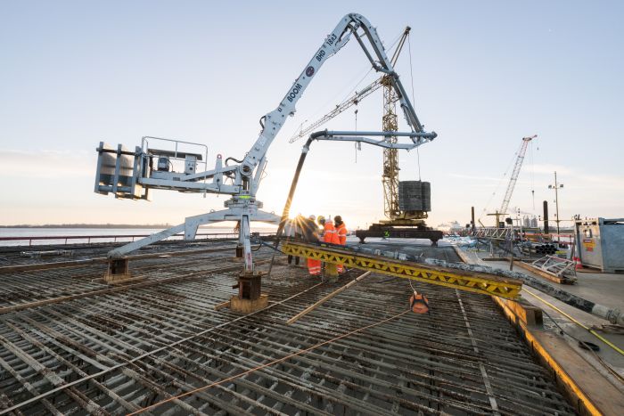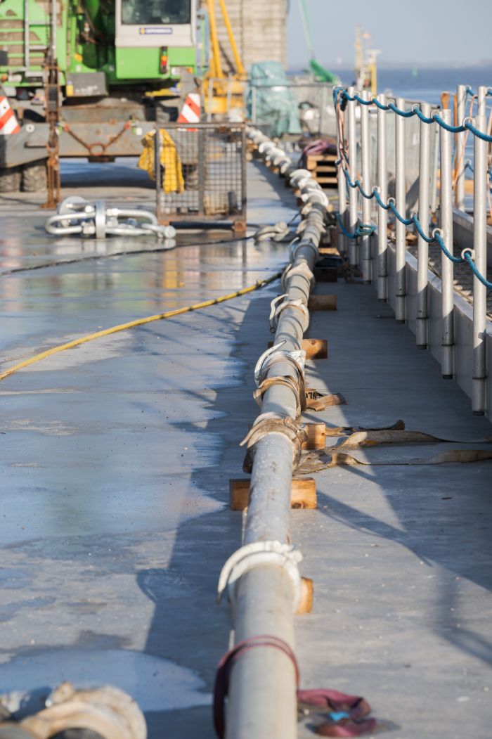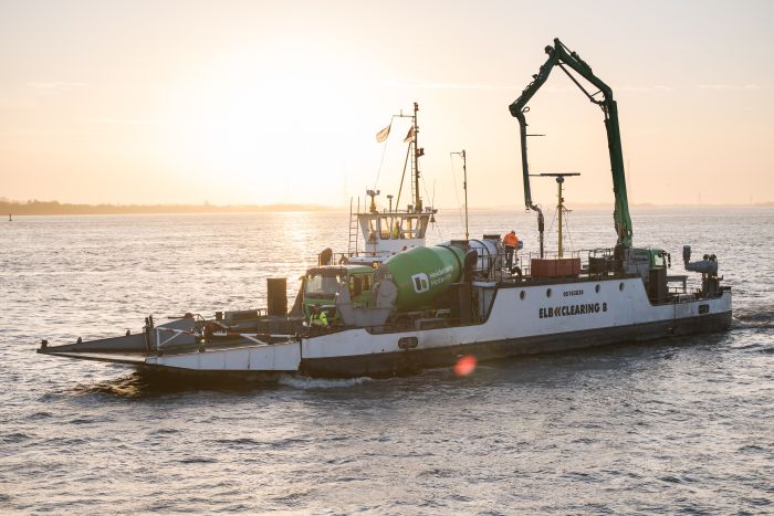 Im laufenden Schiffsbetrieb wurde in Stade der Schlepperhafen erweitert. Über eine 400 Meter lange Rohrleitung und mithilfe einer eigens eingesetzten Autofähre lieferte Heidelberg Materials Spezialbetone in konstant hoher Qualität. Die Erweiterung schafft zusätzliche Liegeplätze für Schlepper, die für den sicheren und präzisen Schiffsbetrieb im Industriehafen unerlässlich sind.