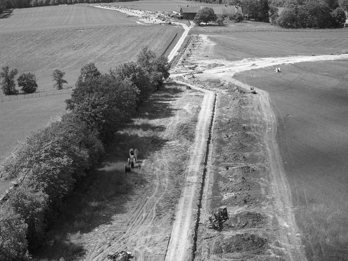 Die Kabel sind in zwei Lagen zu je fünf Kabeln in eine knapp 50 Zentimeter mächtige PowerCrete Flex HBS-Schicht am Boden des Grabens eingebettet. Hierauf folgen 35 Zenti- meter Erdreich und eine 15 Zentimeter starke Schicht aus herkömmlichem Kabelsand, in der Datenkabel verlaufen. Die Deckschicht ist aus Muttererde. „Diese haben wir aus Stabilitätsgründen mithilfe einer Baggerschaufel leicht an- gedichtet“, ergänzt Projektleiter Jarek Hirschberg. Auf die sonst übliche maschinelle Verdichtung der Sandschichten wurde verzichtet, um Kabelmantelschäden zu vermeiden.