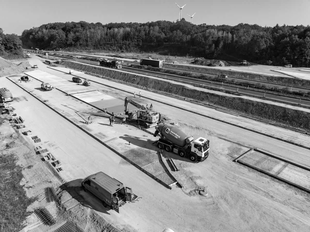 Aufgrund des Pilotcharakters war von vornherein ein enger fachlicher Austausch erforderlich, denn schließlich bedeutete das Projekt für alle Akteure Neuland. Diese waren die Autobahn GmbH als Auftraggeber, die Juchem Asphaltbau GmbH & Co. KG als Auftragnehmer, der Vertrieb durch die Heidelberg Materials Beton DE GmbH, Region Süd-West, Berger Bau als bauausführendes Unternehmen, Heidelberg Materials als Zementlieferant und verantwortliche Prüfinstanz, F.J. Juchem GmbH & Co. KG als Betonproduzent sowie die Bundesanstalt für Straßenwesen (BASt), die das Projekt als oberste Bundesbehörde wissenschaftlich begleitet. Die Juchem-Gruppe zum Beispiel hat das Recyclingmaterial am Firmenstandort im rheinland-pfälzischen Niederwörresbach aufbereitet, den Beton hergestellt und zum rund 45 Minuten Fahrweg entfernten Potzberg geliefert. Heidelberg Materials hat die betontechnischen Prüfungen im Vorfeld und während der Baumaßnahme durchgeführt.