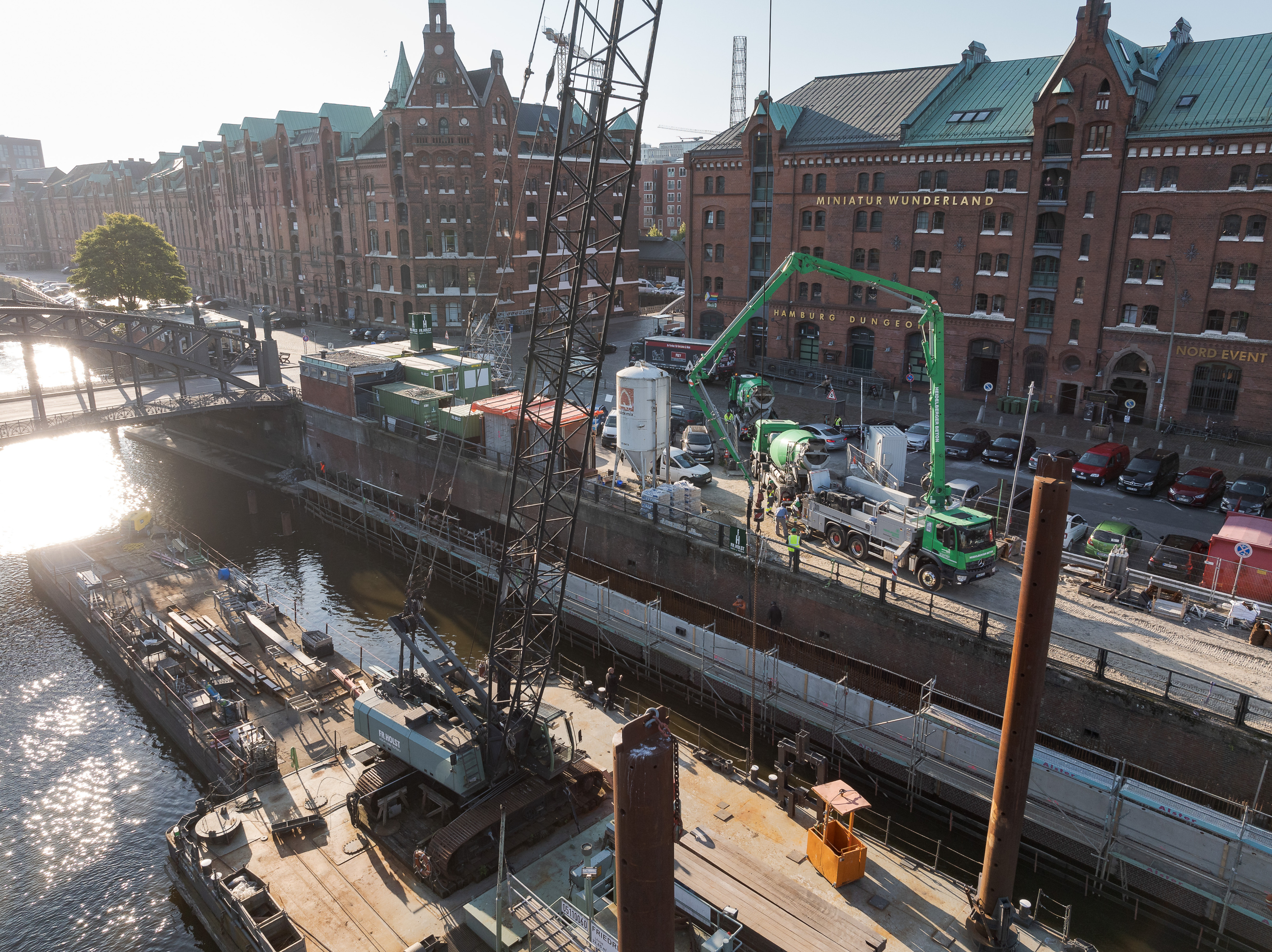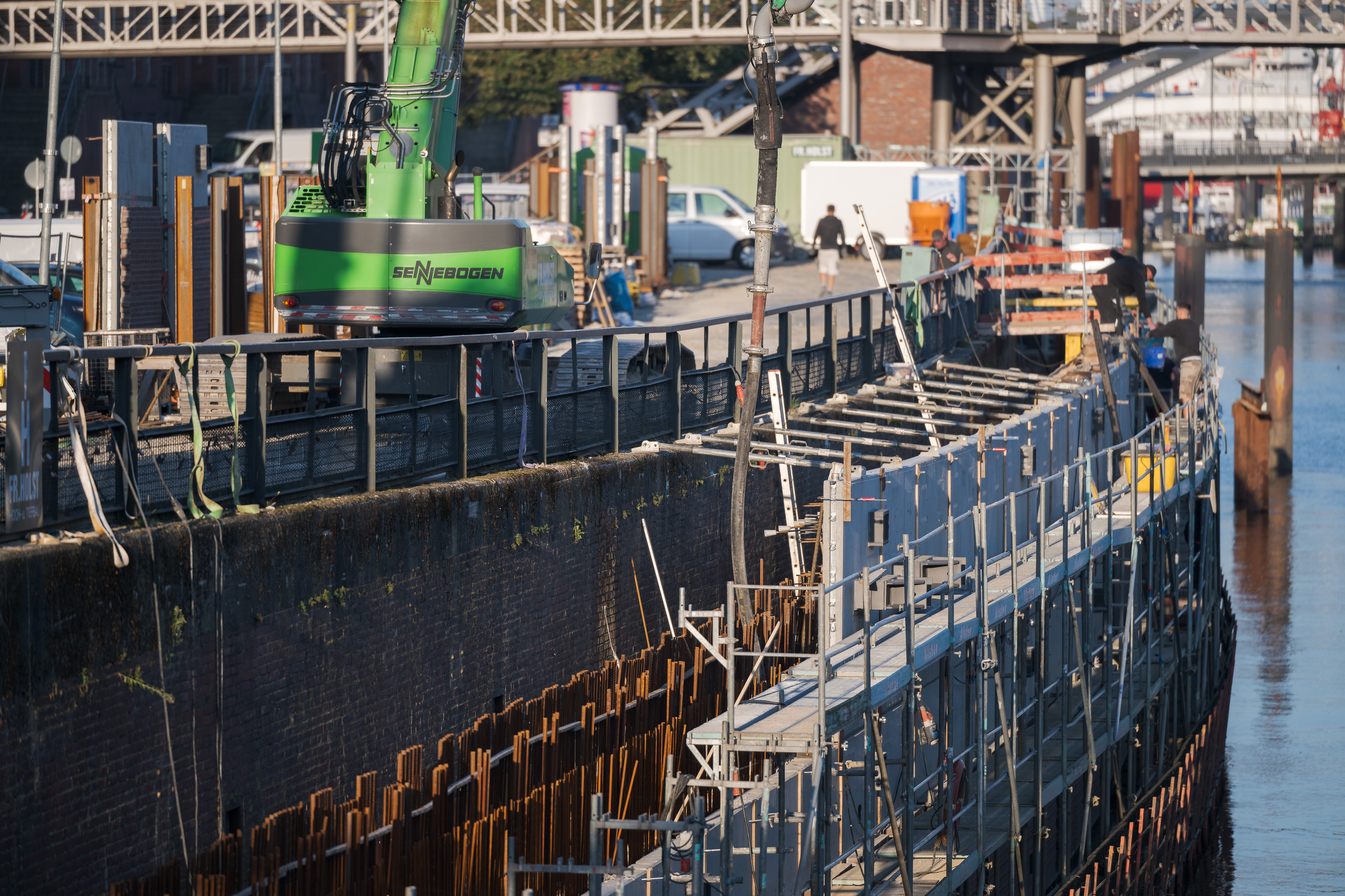 Die anspruchsvollen Wasserbauarbeiten wurden vom traditionsreichen Hamburger Unternehmen Fr. Holst (GmbH & Co. KG) übernommen, das auf eine beeindruckende 150-jährige Geschichte zurückblicken kann. Bereits in den 1950er-Jahren setzte Fr. Holst Maßstäbe in der Rammtechnik und spielte eine zentrale Rolle beim Wiederaufbau des Hamburger Hafens nach dem Zweiten Weltkrieg. Auch heute gilt das Unternehmen als Experte im konstruktiven Ingenieurwasserbau. Die ursprüngliche Uferwand, die um 1880 im Zuge des Baus der Speicherstadt errichtet wurde, stellt ein beeindruckendes Zeugnis der Baukunst des ausgehenden 19. Jahrhunderts dar.