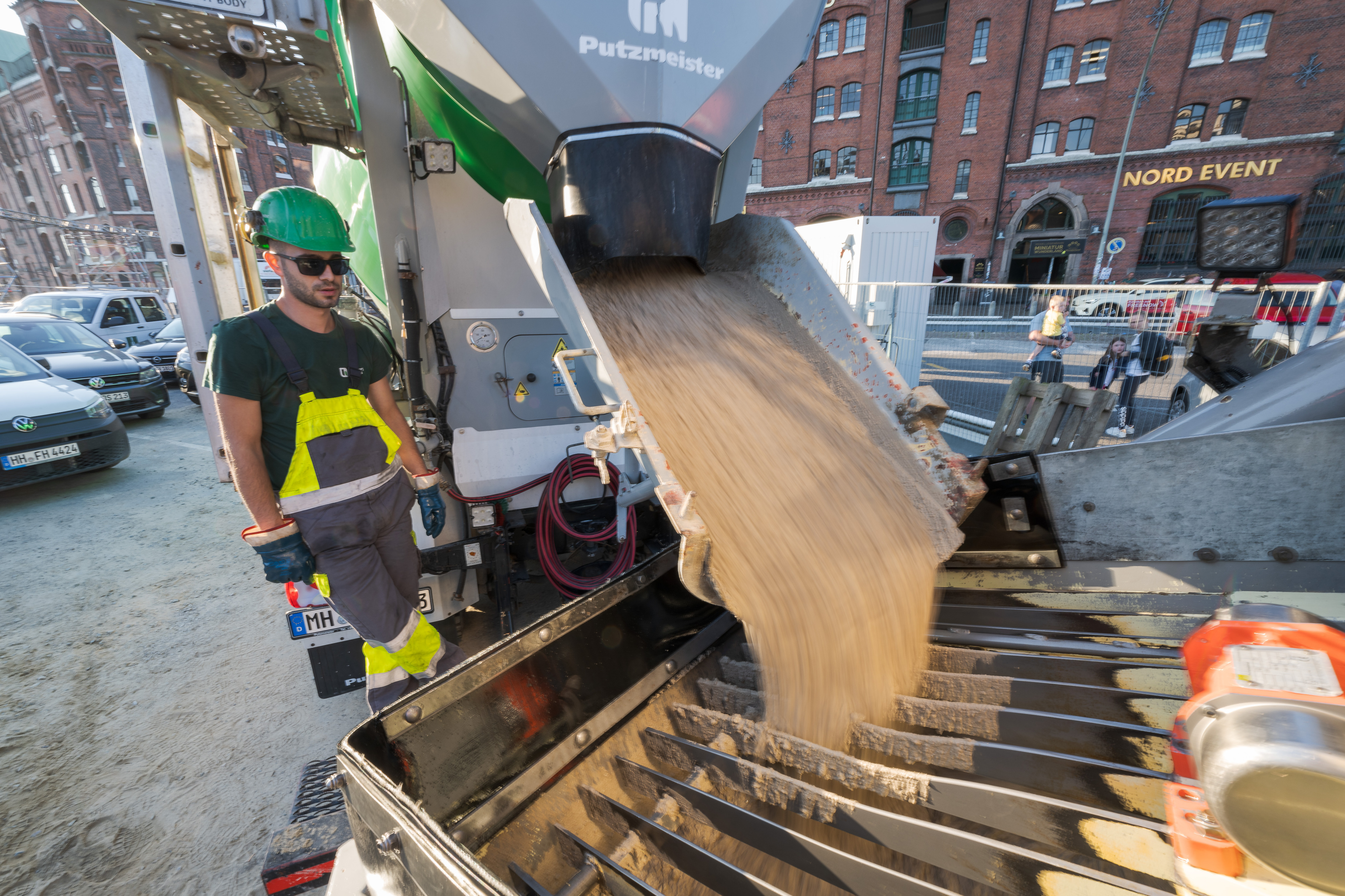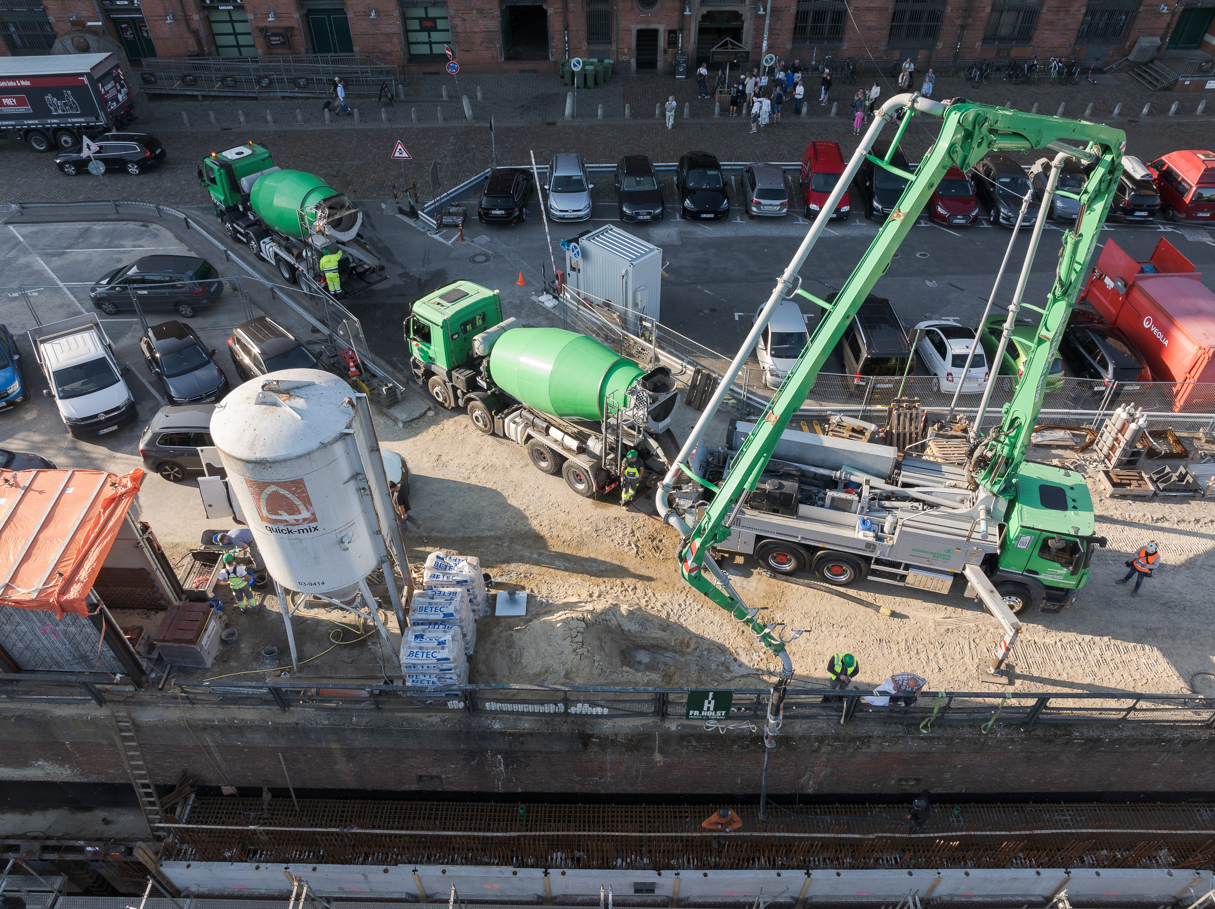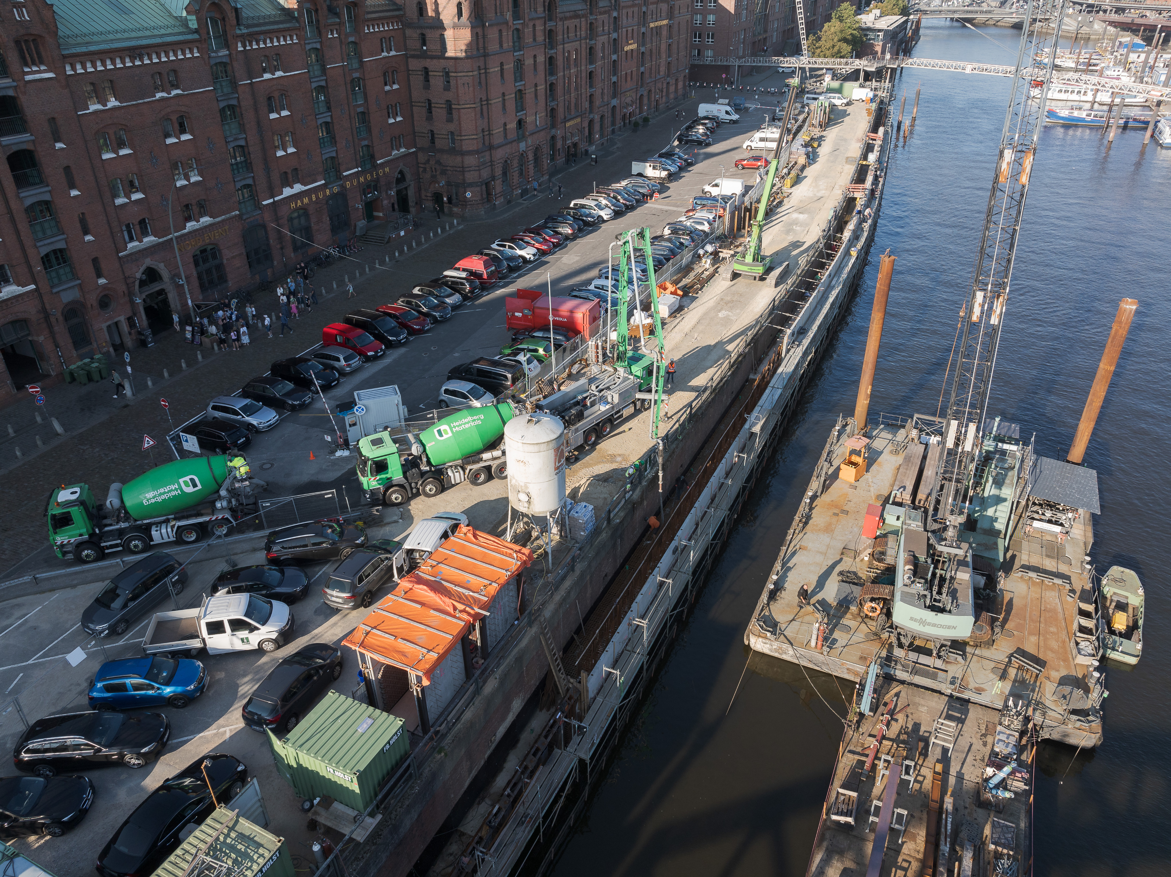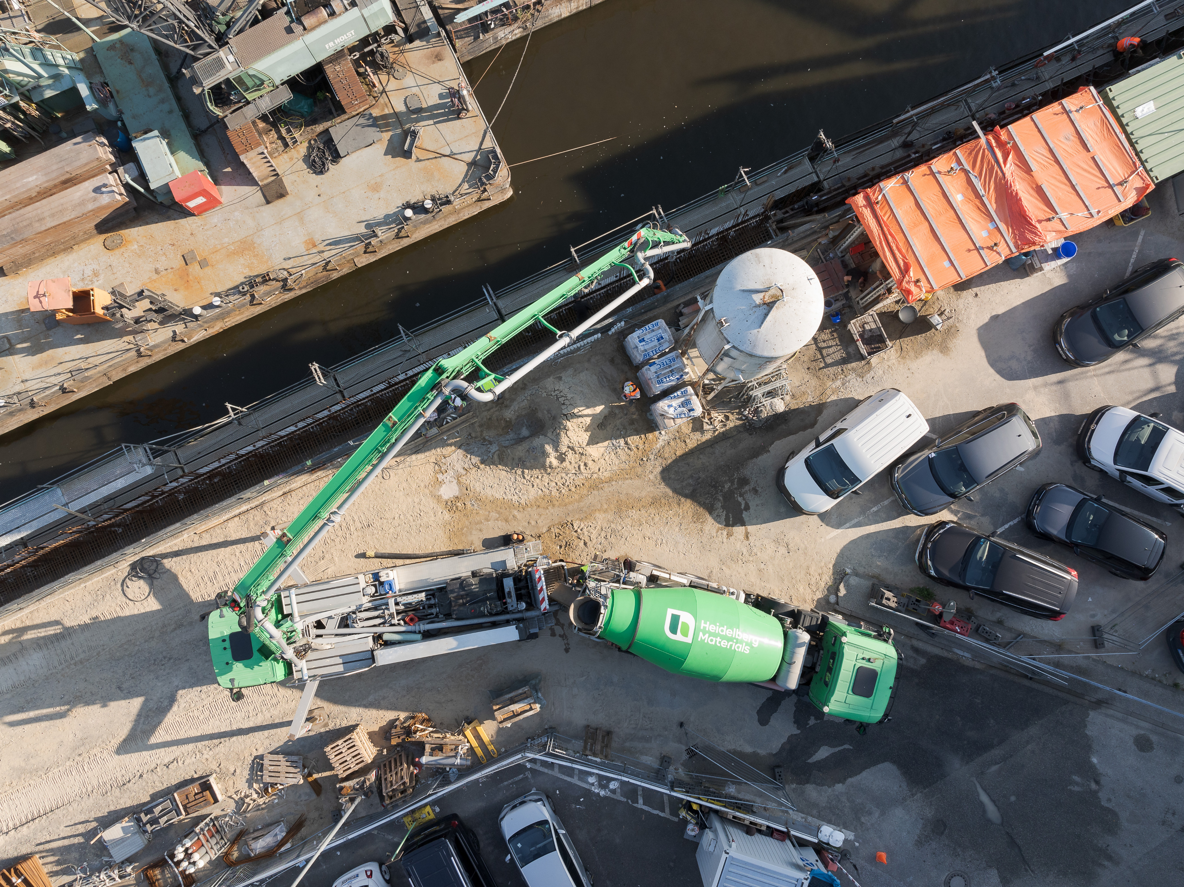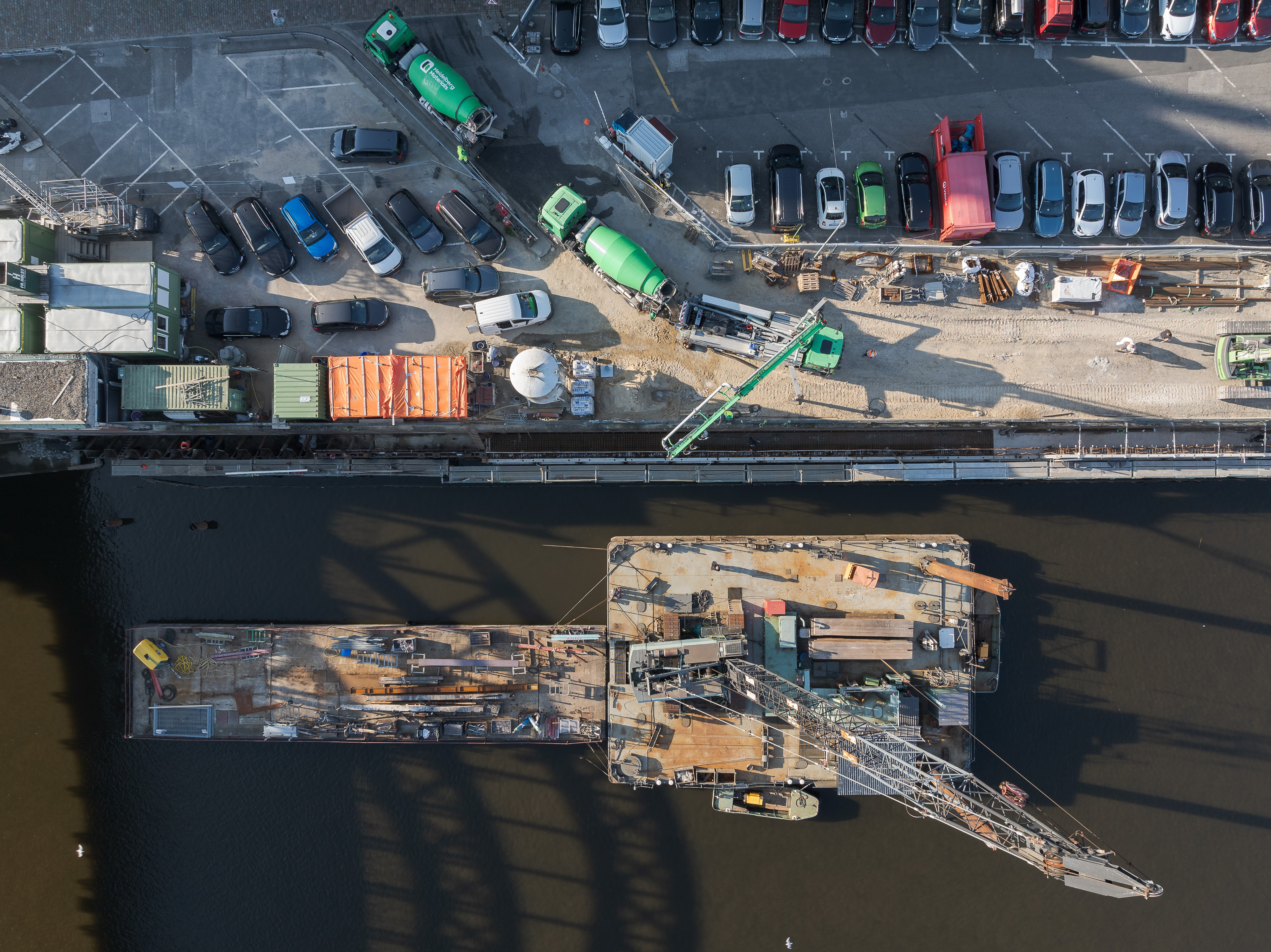 „Die Absperrung des Bereichs vor der Kaimauer für den Publikumsverkehr ermöglichte, auf dieser Fläche die Heidelberger Betonpumpen und Betoniereinrichtungen aufzustellen. Durch diese Maßnahme war es nicht nötig, wie zuvor vorgesehen, von der Wasserseite aus zu betonieren“, so Benjamin Zimmermann, Heidelberg Materials Beton DE GmbH. Eine erhebliche Erleichterung für die Logistik und Koordination auf der Baustelle war auch die App OnSite von Heidelberg Materials. „Wir haben den Beton per App bestellt und behalten dadurch den gesamten Lieferprozess im Blick. In Echtzeit wird angezeigt, wann der nächste Betonmischer beladen wird, wo sich die Fahrzeuge aktuell befinden und wann sie auf der Baustelle eintreffen“, erklärt Rieger.