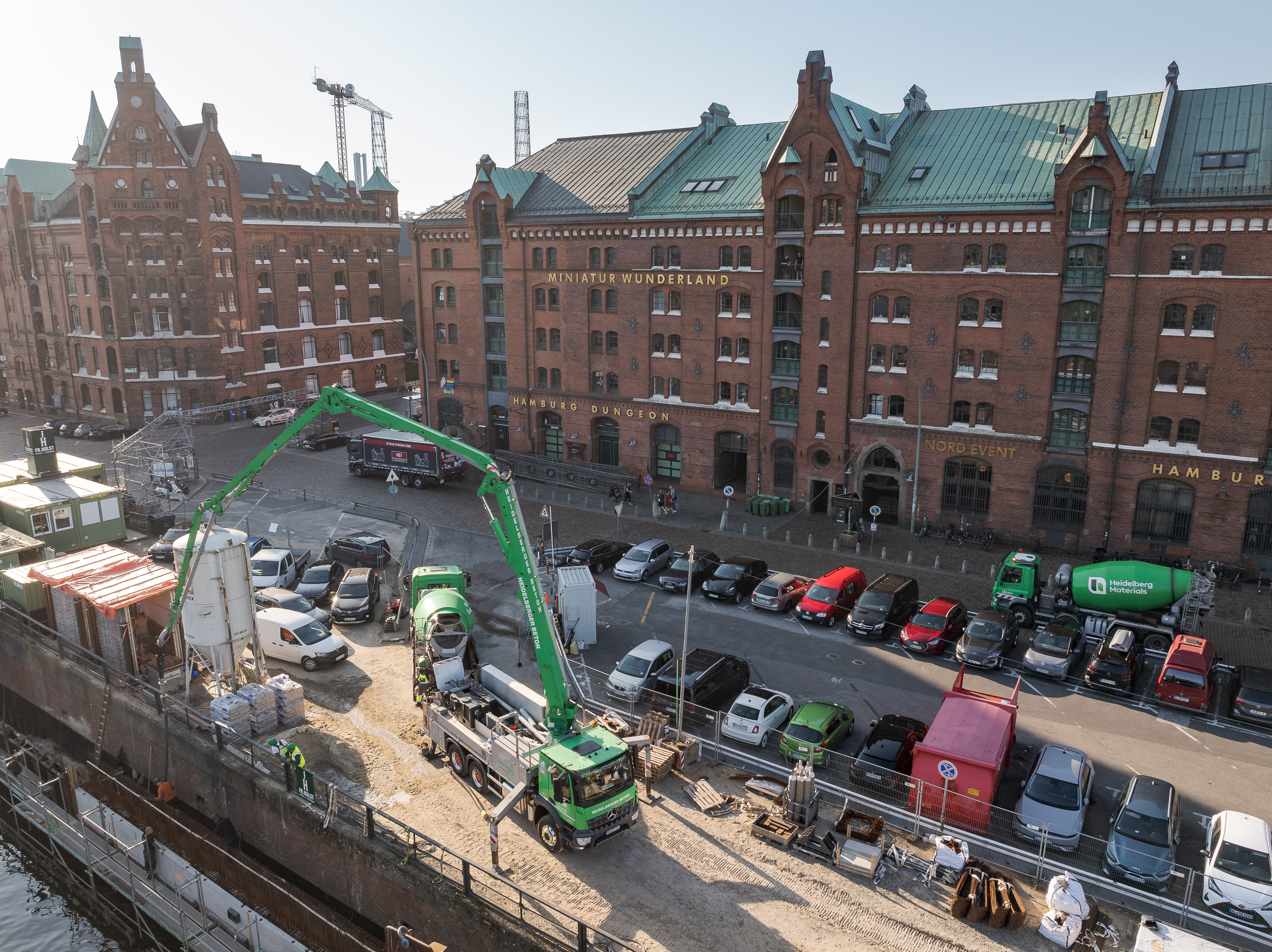 Doch die Speicherstadt ist in die Jahre gekommen, und an vielen Stellen zeigt die Kaimauer am Kehrwieder altersbedingte Abnutzungserscheinungen und Schäden. Wasserbauwerke aus Beton müssen dem Wasserdruck, mechanischen Belastungen durch Schiffe und erheblichen Frostbeanspruchungen standhalten. Bei einer anvisierten Nutzungsdauer von zirka 80 Jahren sind die Anforderungen an die Planung, Ausschreibung, Bauausführung und den Beton sehr hoch. Daher wurde die Kaimauer mit Hilfe einer speziellen Betonrezeptur für Wasserbauwerke von Heidelberg Materials saniert.