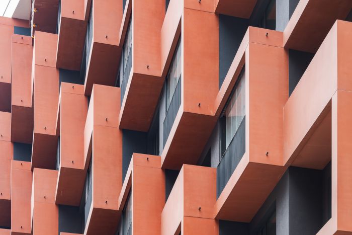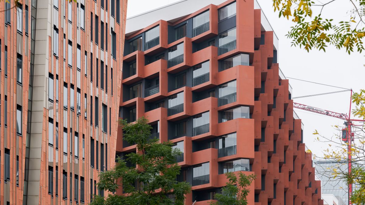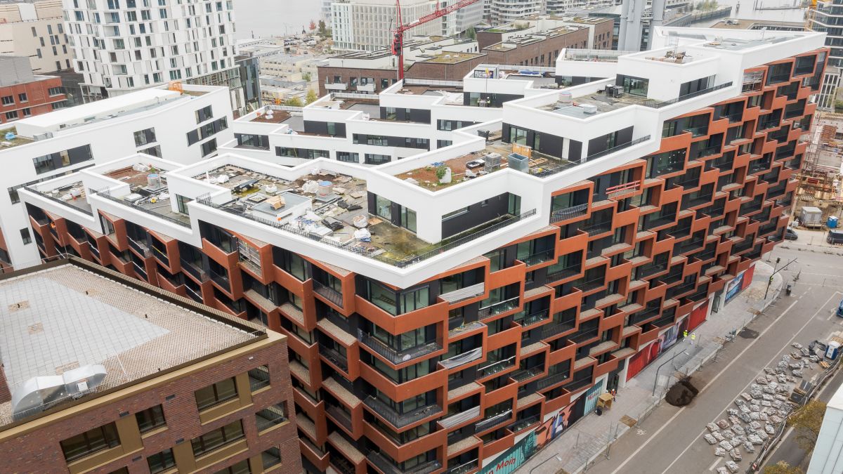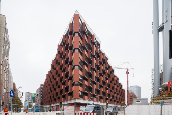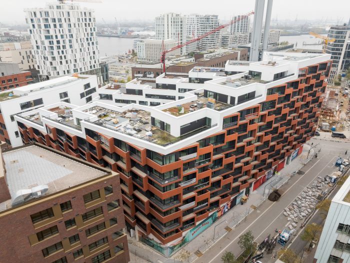 Im Überseequartier in der HafenCity in Hamburg ist das neue „Eleven Decks“ ein markantes Landmark. Wie ein Terrassenhaus treppt sich der Wohnkomplex nach Süden ab, vorgesetzte Balkone und Loggien aus rotem Architekturbeton beleben die Fassaden. Carsten Roth Architekt aus Hamburg hat den neuen Stadtbaustein mit 306 Wohnungen als u-förmigen Baukörper entworfen. Das entlang der Straßenseiten bis elf Geschosse hohe Gebäude stuft sich nach Süden mit großen Dachterrassen ab. Diese Plastizität wird durch die Fassadengestaltung unterstrichen: Balkone und Loggien aus durchgefärbtem Sichtbeton verleihen den Ansichten Tiefe und beleben sie durch Licht- und Schattenspiele. Sie gliedern das große Bauvolumen und verringern optisch dessen Massivität.