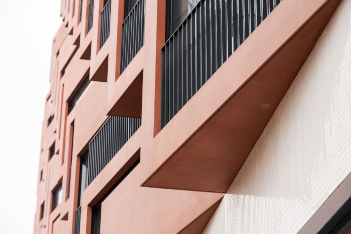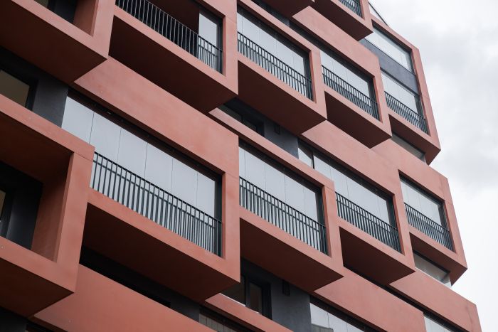 Die Aufgabe war anspruchsvoll: Die Balkone sollten sowohl zur Straße als auch auf der Innenseite die gleiche Sichtbetonqualität aufweisen – dies war nur mit monolithischen, durchgefärbten Bauteilen möglich.